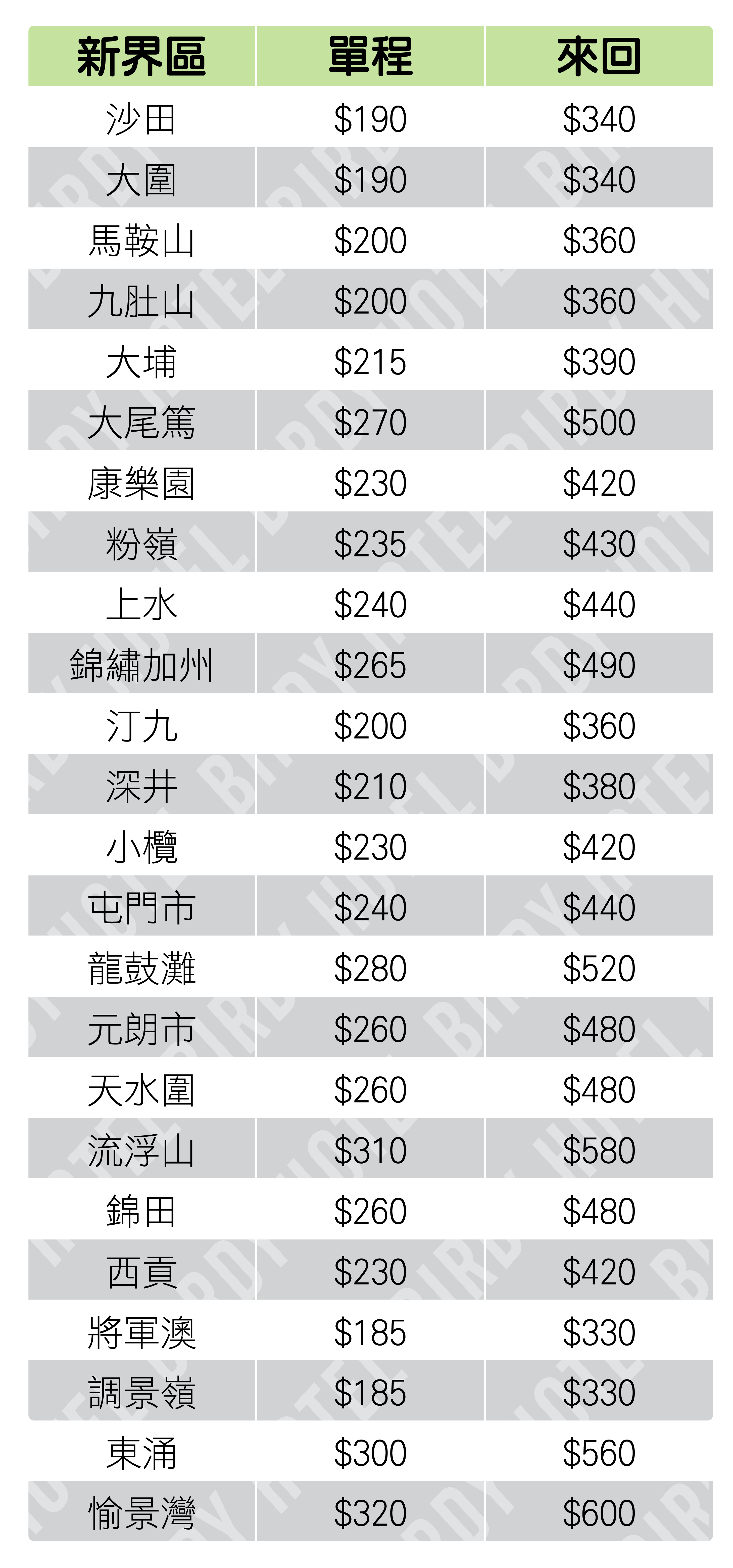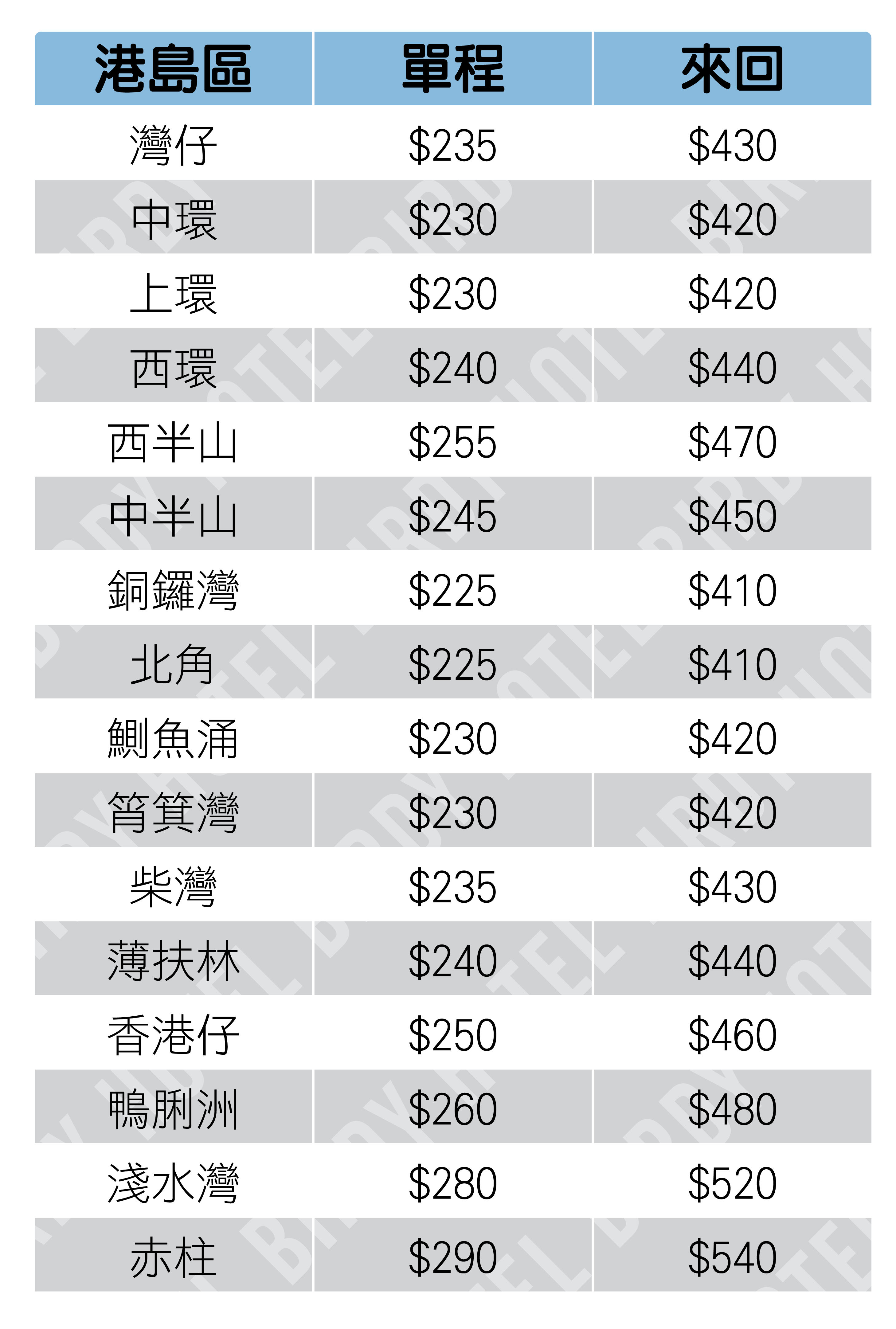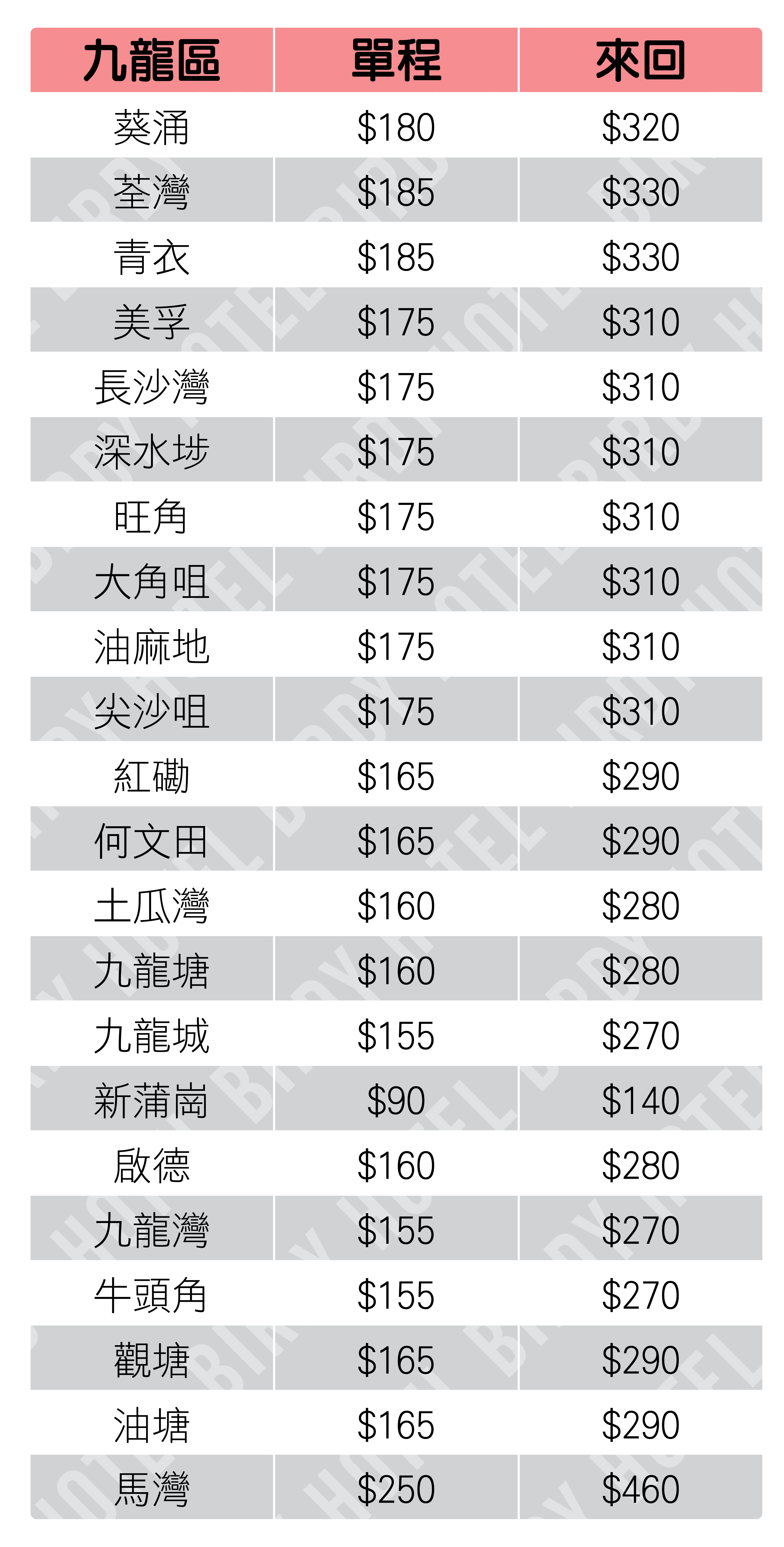 (價目由2019年8月份更新及使用)